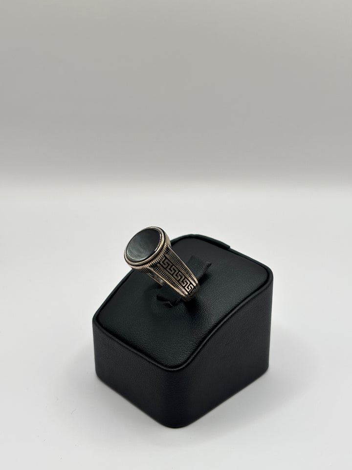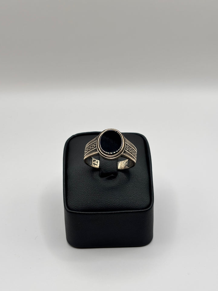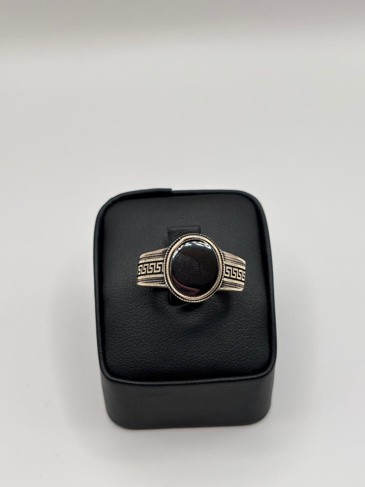 טבעת כסף ייחודית עם אבן עגולה שחורה ומבריקה במרכז, משולבת בעיטורים אתניים בצדדים. עיצוב קלאסי שמעניק מראה אלגנטי, עוצמתי ומלא אופי – טבעת מושלמת לגבר שאוהב נוכחות.