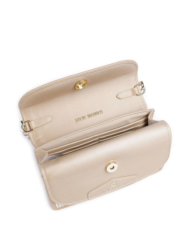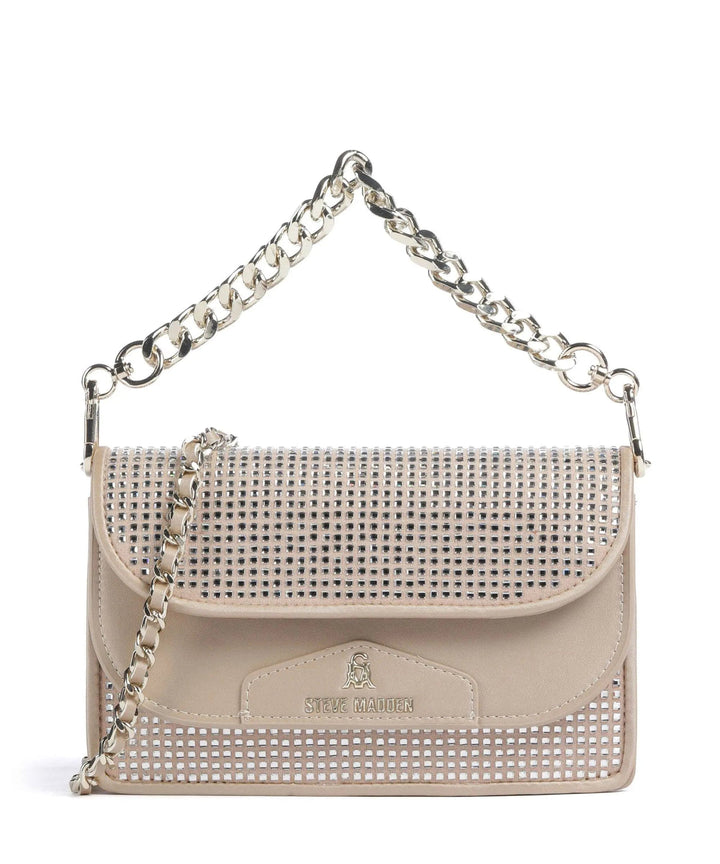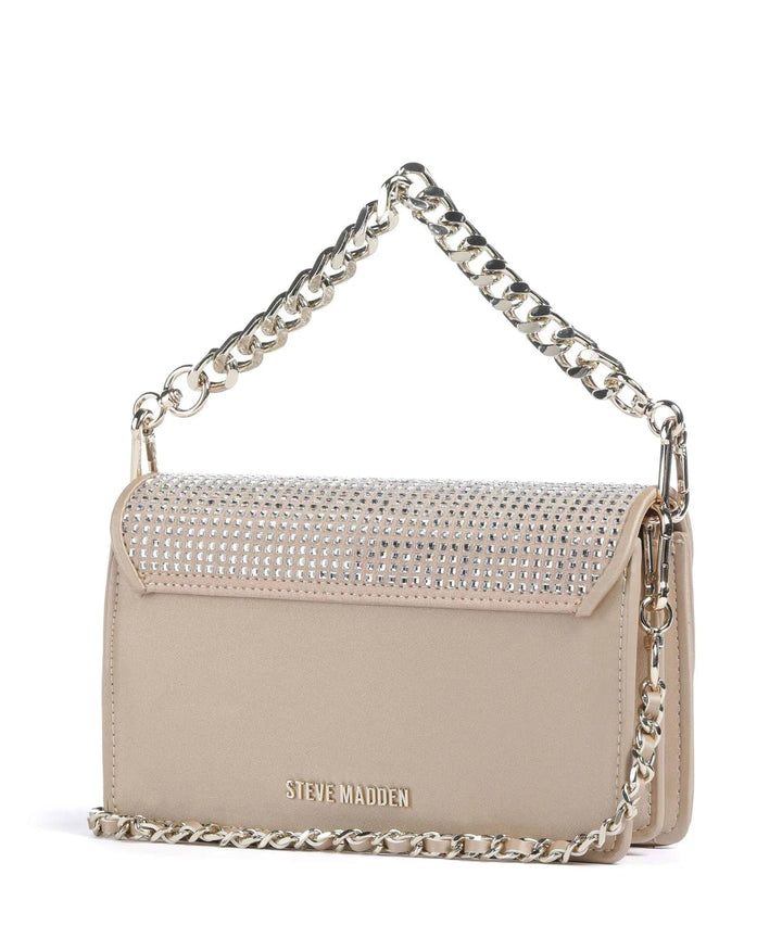 תיק יד לנשים בגוון שמפניה משובץ אבנים עם רצועת שרשרת כסופה ורצועת נשיאה נוספת הניתנת להסרה מבית סטיב מאדן