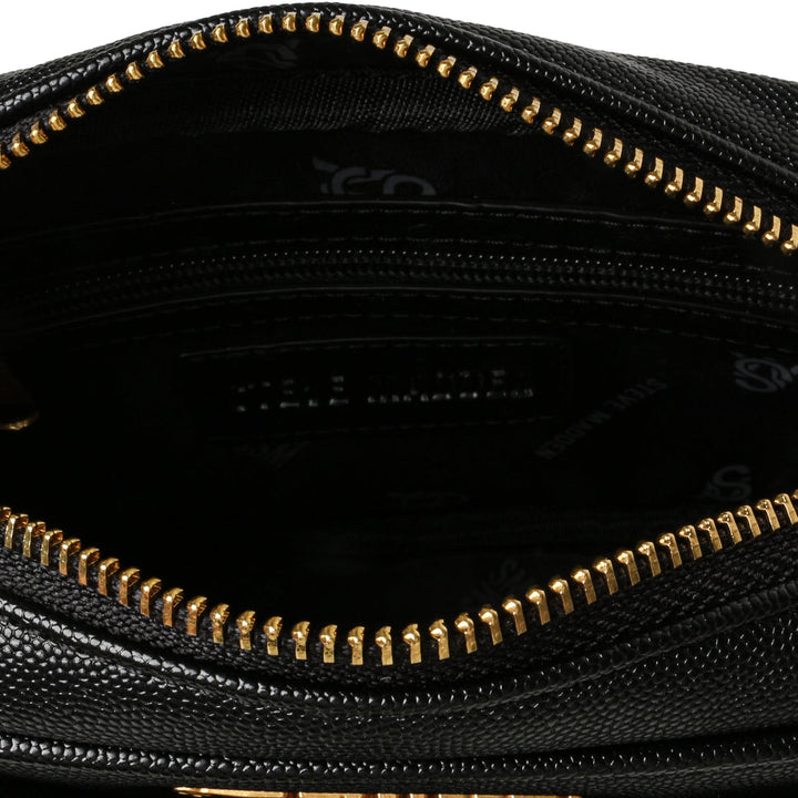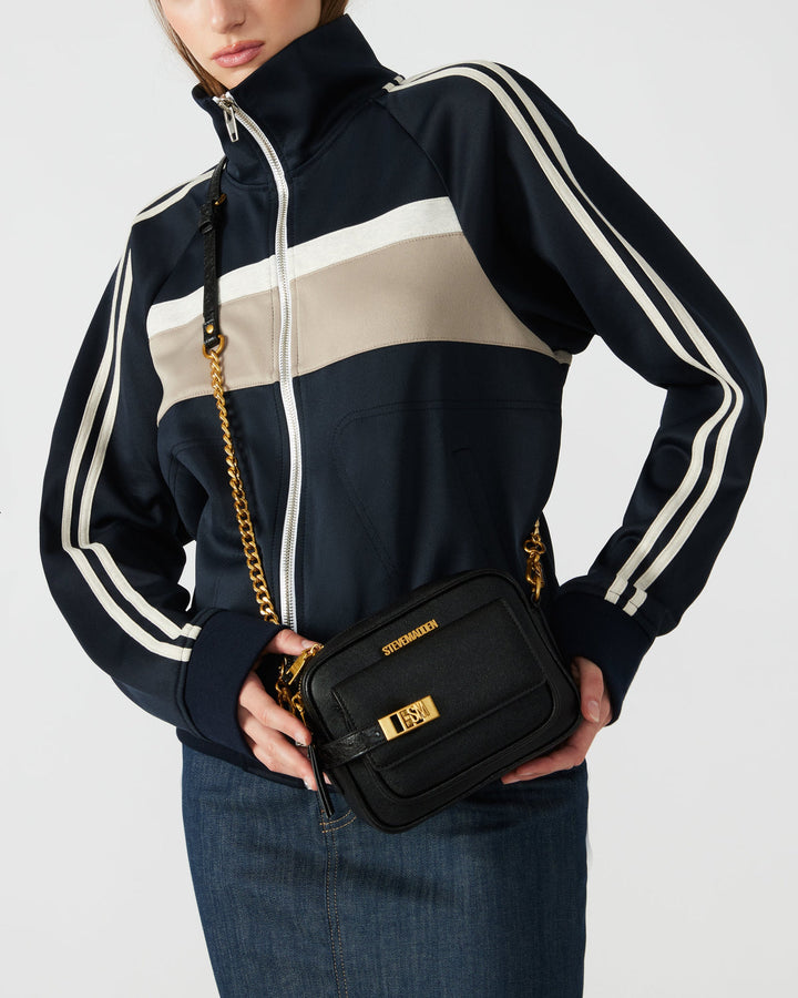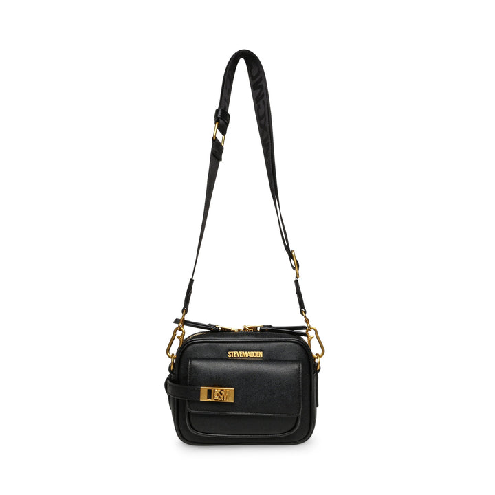 תיק צד לנשים בשחור עם כיס חיצוני ולוגו ואבזמים זהובים מבית סטיב מאדן
