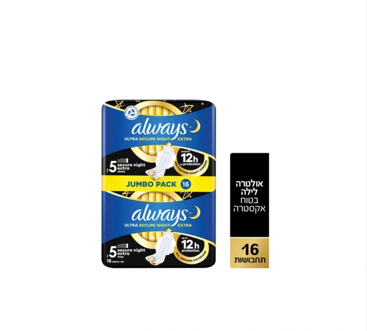 • התחבושות ההיגייניות אולוויז אולטרה לילה בטוח אקסטרה (מידה 5) עם כנפיים, תוכננו עם מאפייני הגנה משולשת כדי שלא תתעוררי באמצע הלילה לבדוק אם התרחשו דליפות או להחליף את התחבושת שלך