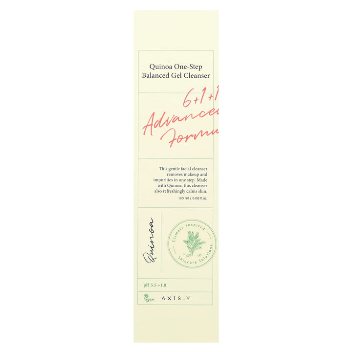 ג'ל ניקוי מקינואה שלב אחד מאוזן מבית AXIS-Y הוא בעל נוסחה ייחודית המכילה רכיבים טבעיים מובחרים כגון קינואה, תה ירוק, סנטלה אסיאטיקה ושמן שקדים מתוקים, לשטיפה עדינה ומעניקה לחות תוך שמירה על רמת החומציות החומציות של העור של 5.5
