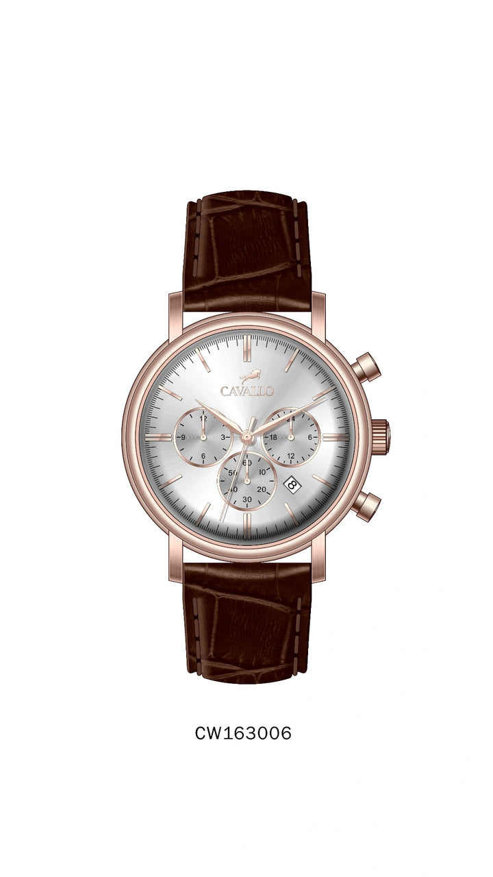 שעון יד איכותי רצועת עור חומה לוח כסוף מסגרת רוז גולד כרונוגרף עם תאריכון אחריות שנתיים